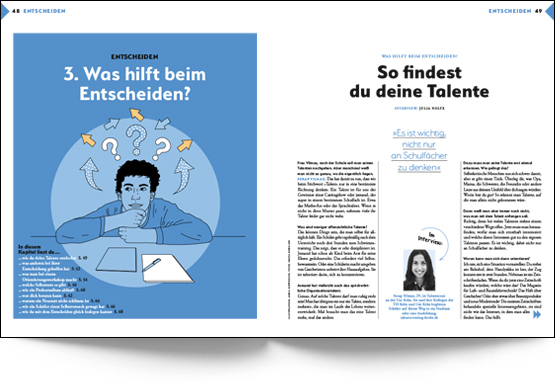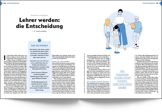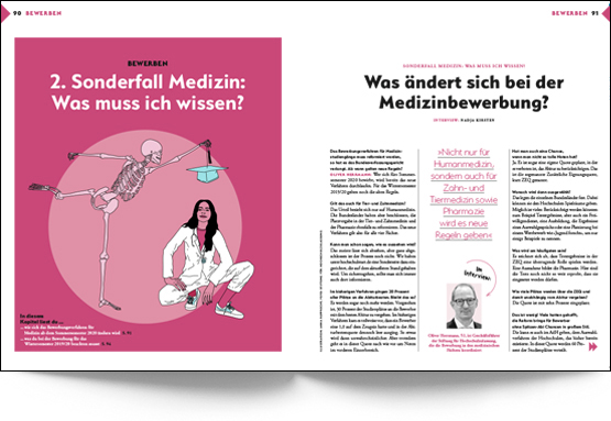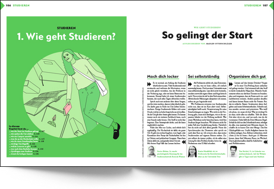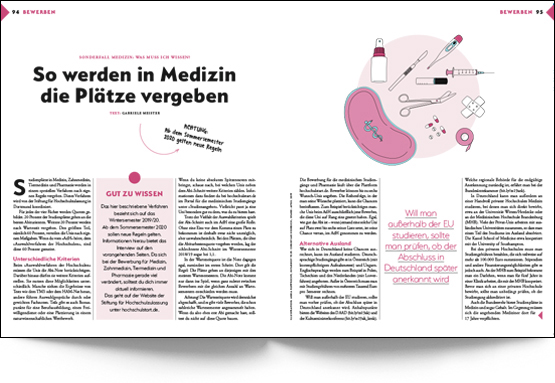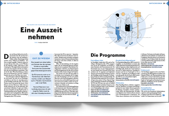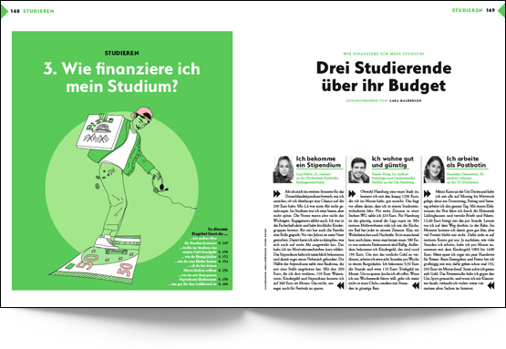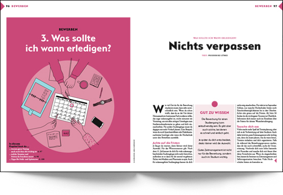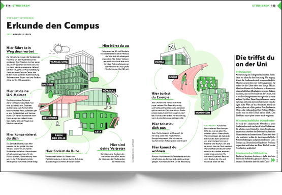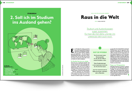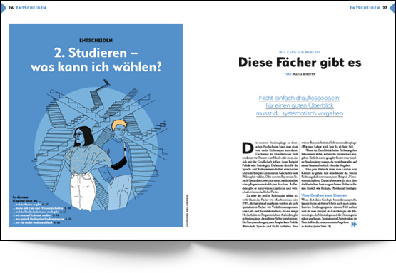 Für noch mehr Orientierung bei der Studienwahl haben wir den Studienführer 2019 weiter geschärft. Wir haben das Farbkonzept noch strenger genommen und innerhalb jedes einzelnen Ressorts drei große Fragen gestellt, die jeweils mit großen farbflächigen Auftaktseiten Orientierung zwischen den Anzeigen geben. Die doppelseitigen Auftakseiten habe ich mit Maja Metz umgesetzt. Die tollen Illustrationen hat in diesem Jahr Anna Rupprecht für uns gemacht. Das Cover hat Brita Sönnichsen fotografiert.